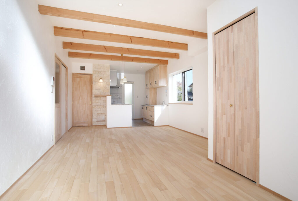 リビングは天井高を少しあげ、無垢の梁を一部表しにすることで漆喰との相性の良い