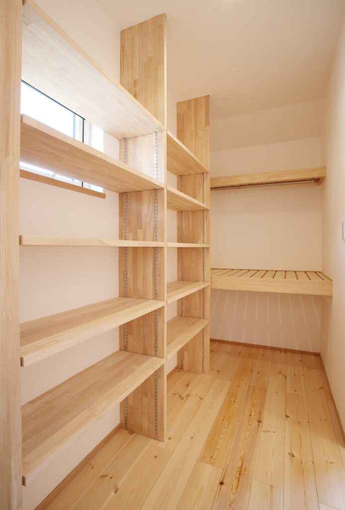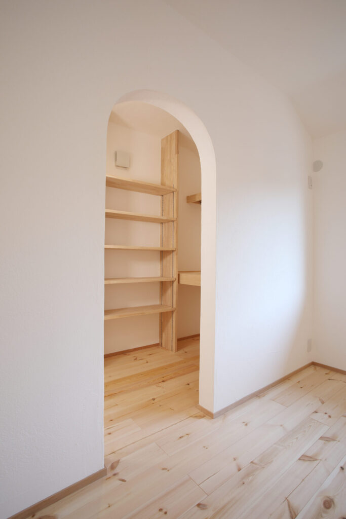 フローリングにはインドネシア松とロシアンパイン、建具にはシンゴンの米のり集成材を使用しています。寝室に隣接してWICを設置。無添加住宅らしく下がり壁部分の開口はRにしています。