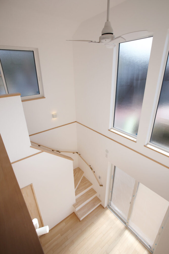 南側に設けた大きな吹き抜けの窓からは、お天気の良い日はリビングの奥まで