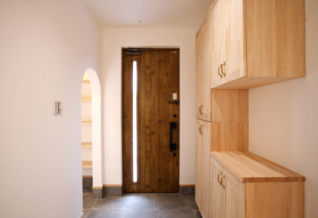 玄関にもシューズクロークと米のり集成材の玄関収納を設置。
