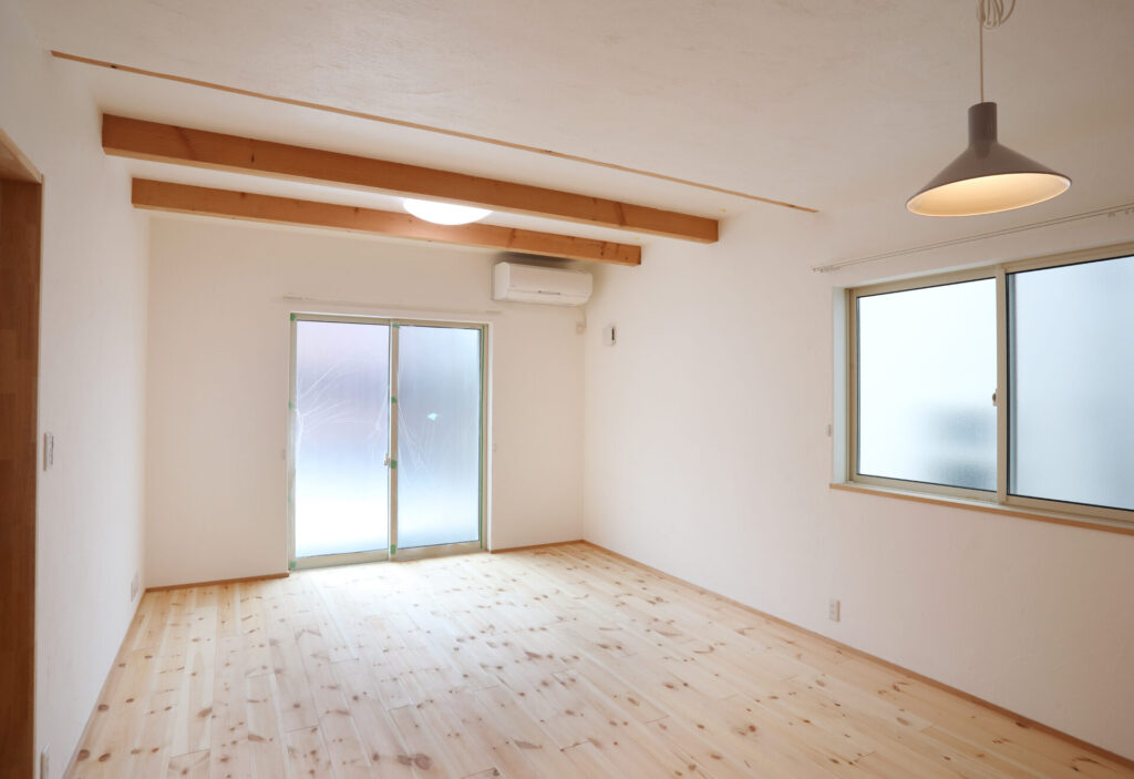 床材にはパインを採用。多くの輸入材は、防虫・防カビのために薬剤による燻蒸処理が一般的ですが