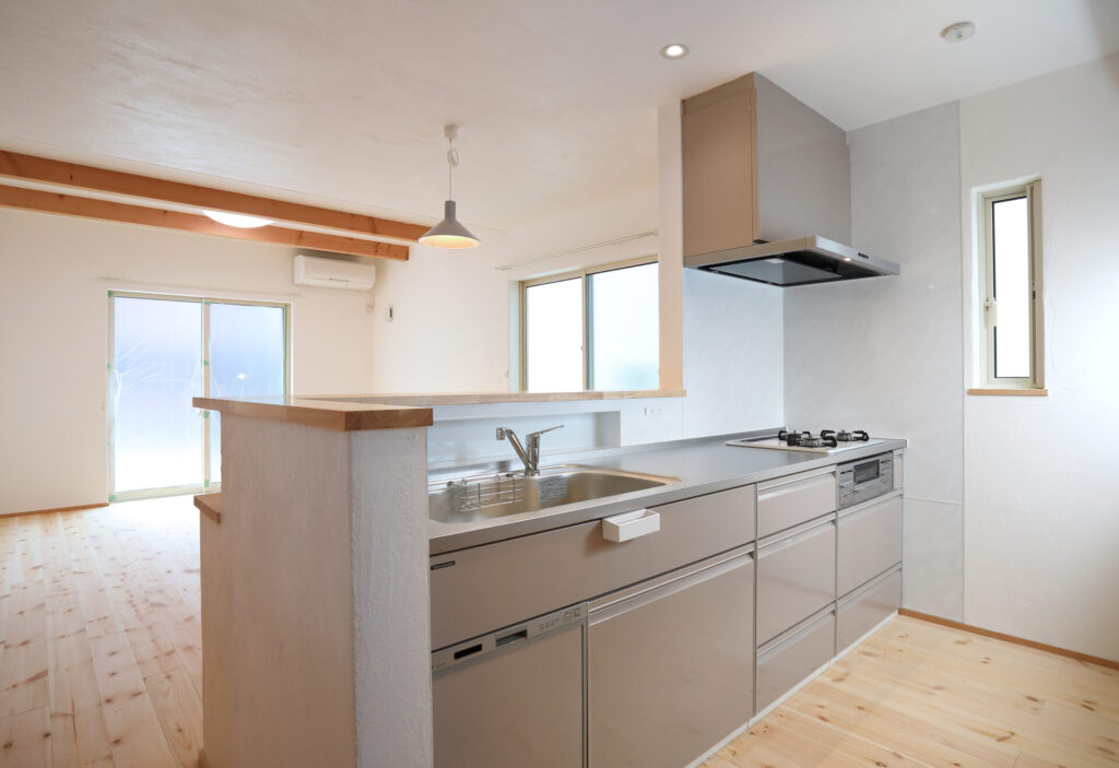 タカラスタンダードのニュアンスカラーのキッチンを採用し、白い漆喰との相性も◎