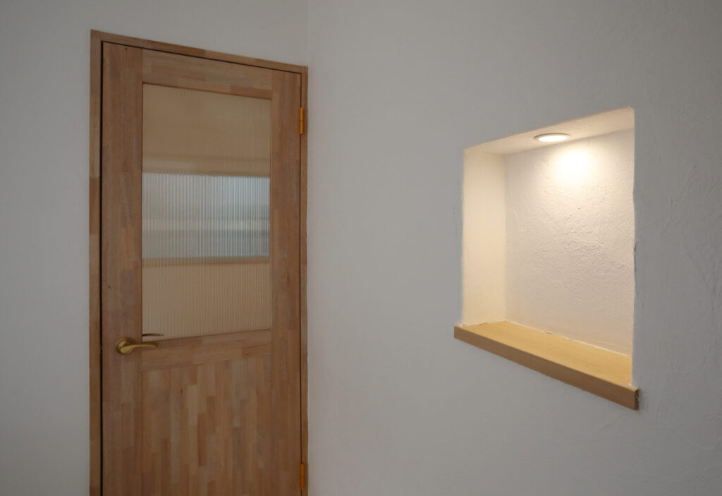 米のり集成材のキャビネットを設置。細々としたものにももってこいの収納スペースです。